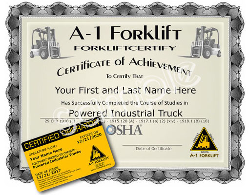 Based in Anaheim, California, A-1 Forklift Certification provides high-quality online forklift certification, on-site courses, hands-on training, aerial lift training and train-the-trainer courses. Our team has more than 30 years' experience in forklift operation and warehouse management. Earn a better living. Start a new career. Ensure optimal workplace safety.